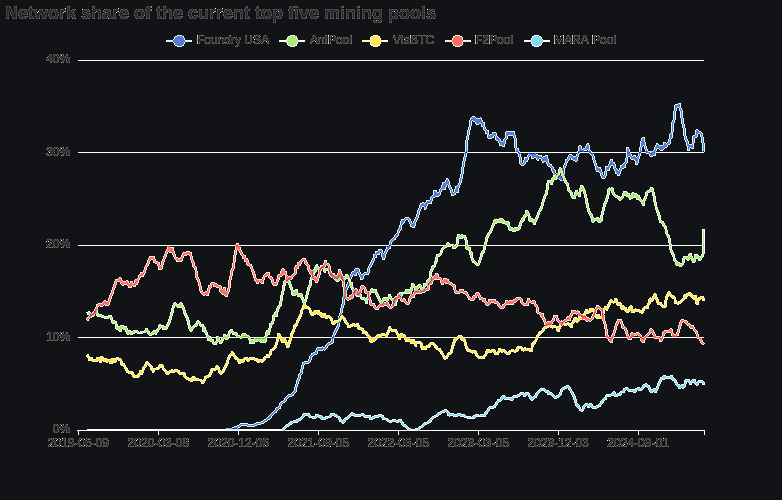 The image shows the top five mining pools' network share from May 2019 to Aug 2024. It will be embedded with a caption in the decentralization section, highlighting centralization and possibly supplemented by a chart on Bitcoin energy consumption.