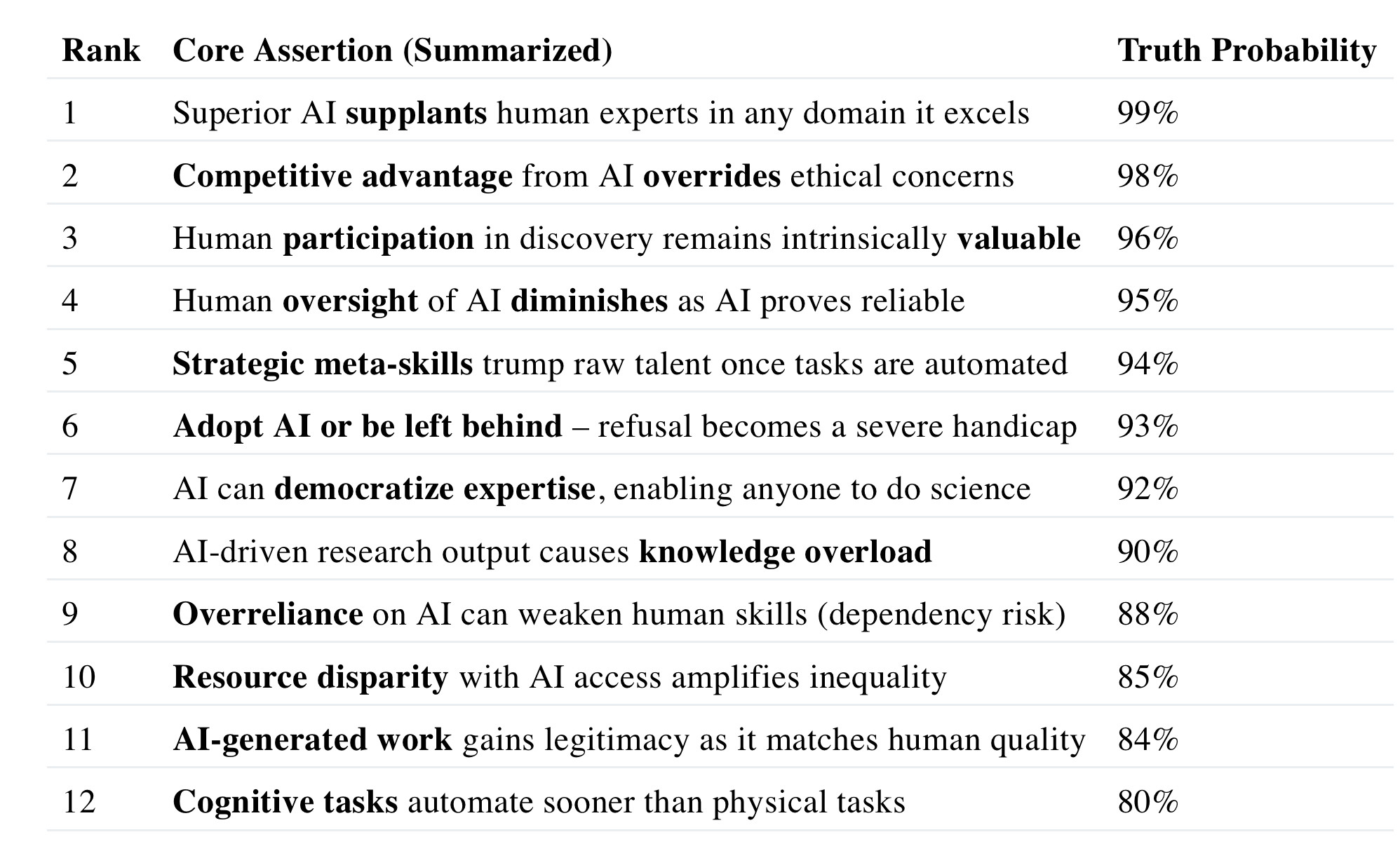 Truth Probability: 84%. This assertion is well on its way to being true and likely to solidify as AI capabilities grow. We give it a slightly lower probability than some others only because social acceptance can sometimes lag or have irrational elements. There may be policy debates (for example, journals might require disclosure of AI use, or there may be battles over what counts as “authorship”). But in the long run, it’s hard to argue with success: if AI contributions lead to correct and useful outcomes, they will be accepted. Therefore, this truth – results over provenance – should hold in the grand scheme, repeating the pattern seen with previous technology integration in professional work.