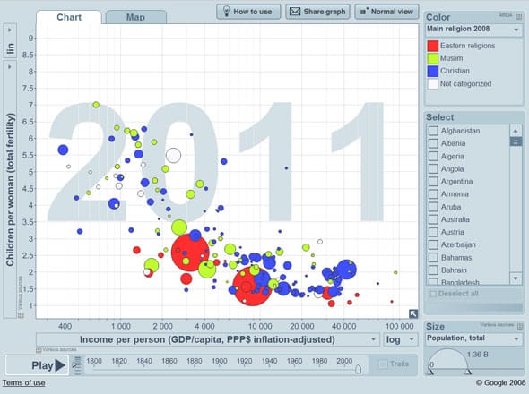 When you watch fertility vs. income animated over time, colored by religion: