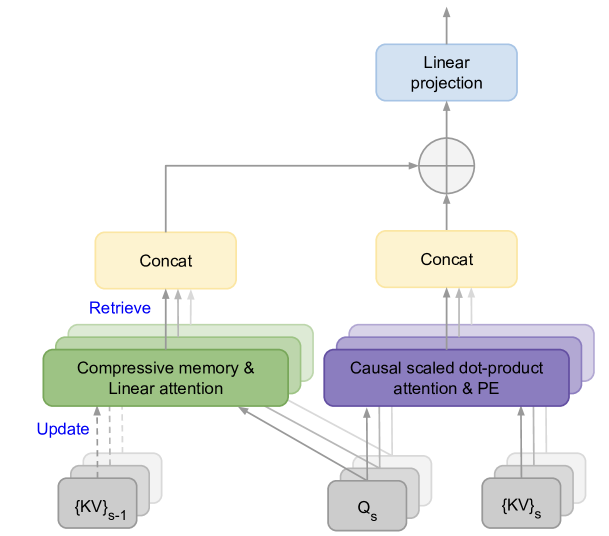 Diagram: Infinite Context via Compressive Memory – Google’s Infini-Attention architecture integrates a long-term memory module into the Transformer. The model keeps a fixed-size compressive memory (green) for older tokens, while using local self-attention (purple) for recent tokens. As new text comes in, older attention information is compressed and stored (down arrows) instead of being dropped, and can be retrieved later (up arrows) when needed for context. This clever design allows the Transformer to process texts of arbitrary length without its memory or computation growing unmanageable. In essence, the AI remembers earlier parts of the sequence indefinitely by storing a distilled form in long-term memory. Such innovations enable models to maintain coherence and recall facts even over millions of words – a foundational step toward infinite memory in a Second Brain.