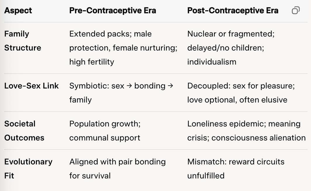 Challenging fairness: This narrative risks romanticizing pre-modern patriarchy; data shows contraceptives reduce poverty and enhance mental health in resource-poor settings. Yet, aggregate societal costs—collapsed "manadas" (packs)—demand scrutiny: loneliness as evolutionary penalty for defying reproductive logic.