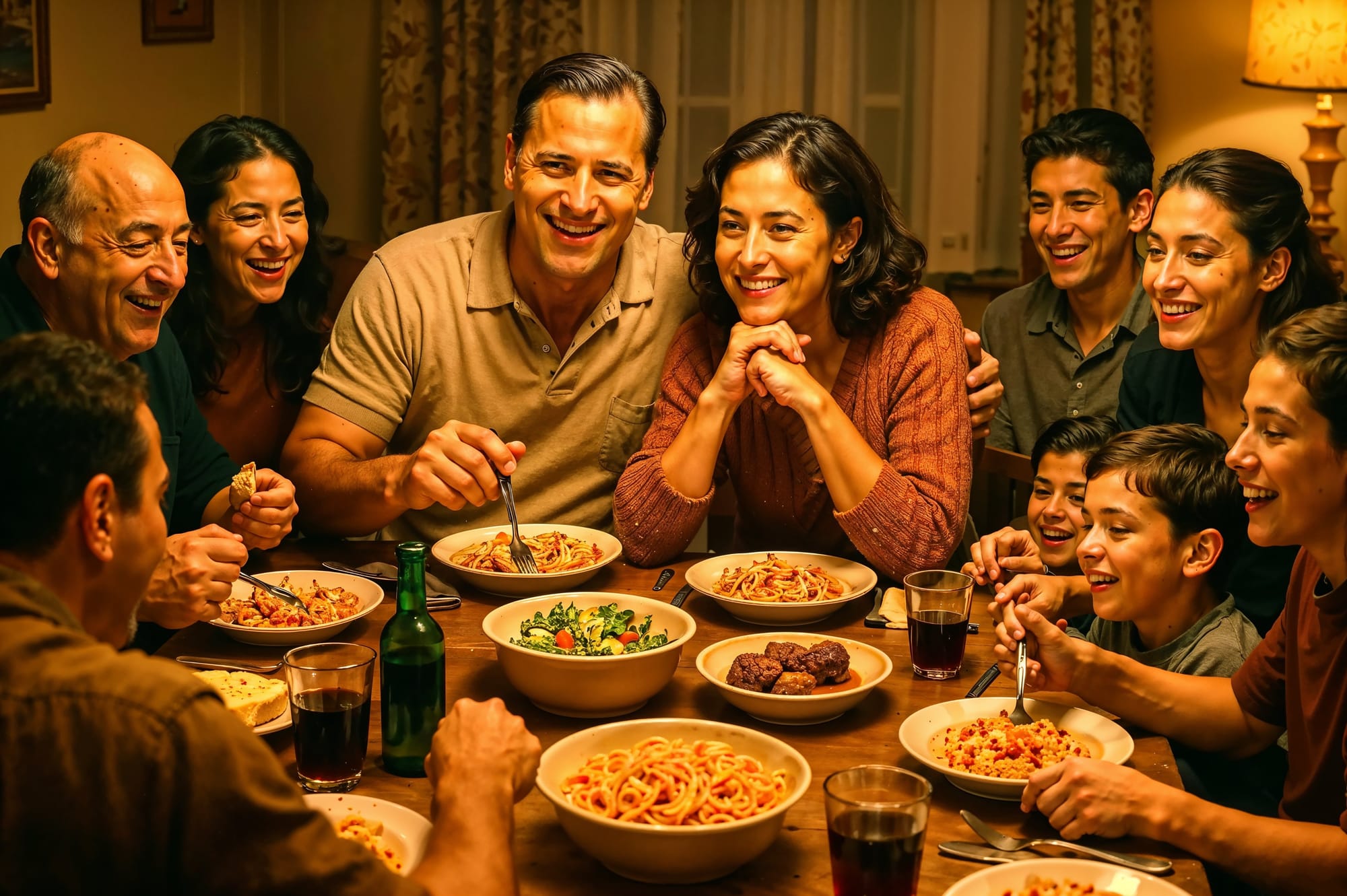 The table with pasta and wine and three generations talking over each other. The grandmother serving, the grandfather telling stories, the children running underfoot, the chaos and noise and life.